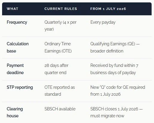 From 1 July 2026, that changes entirely. SG must be paid on every payday, and those contributions must be received by the employee's super fund within 7 business days of each payday.