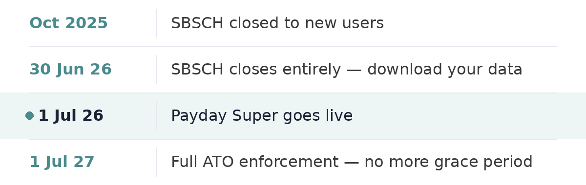 The ATO's Small Business Superannuation Clearing House (SBSCH) is being retired. It closed to new users on 1 October 2025, and closes entirely on 30 June 2026. If you currently use SBSCH, you must: